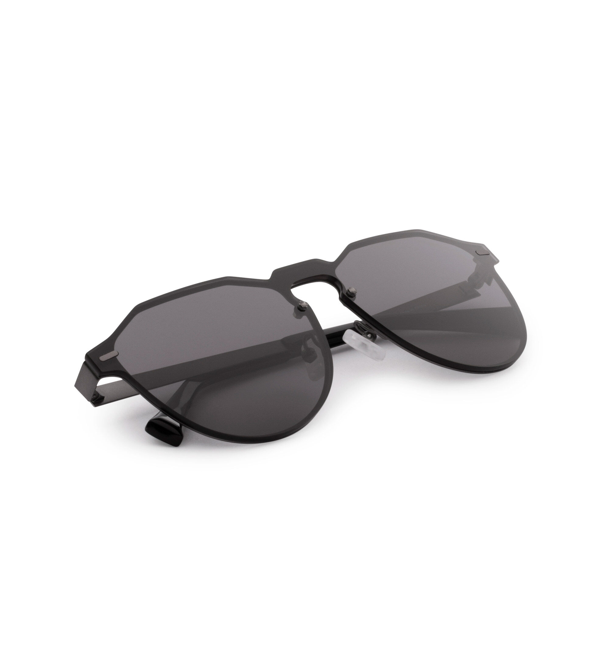 Warwick-style full front sunglasses with matte graphite metallic frame and black shield lenses. No gender model Nylon lenses which offer improved sharpness and resistance for greater optical performance Category 3 lenses with UV400 protection which offer superior antiglare protection Base curve 2 nearflat frame front Nickelfree stainless steel frame front for high corrosion resistance and increased strength Antislip, antiallergy silicon nose pads 3 barrel hinge for improved grip and durability Temples made of TR90 from EMS, considered the best nylon in the world for eyewear frames greater flexibility and resistance Size: Front 13,8 cm, Height 5 cm, Temples: 14 cm Includes: Microfiber cover, box and set of decorative stickers