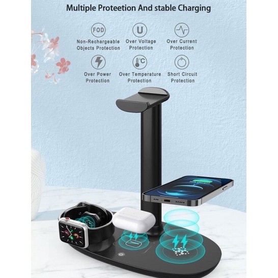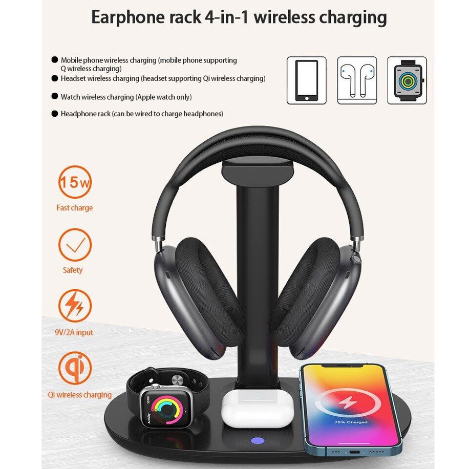 DESKTRON 4-IN-1 Wireless Charging Station. 15W Qi Fast Charging Dock Headset Rack. Headphone Display Rack Compatible for iPhone 13, Airpods iWatch and other phone with wireless charging function.