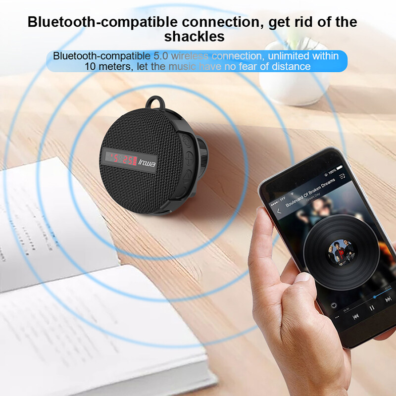 4. Portable and compact design: Appearance size: 93*87*47mm, this mini bluetooth-compatible speaker can be easily carried with you. And with a metal hook, it is more convenient to carry when traveling.