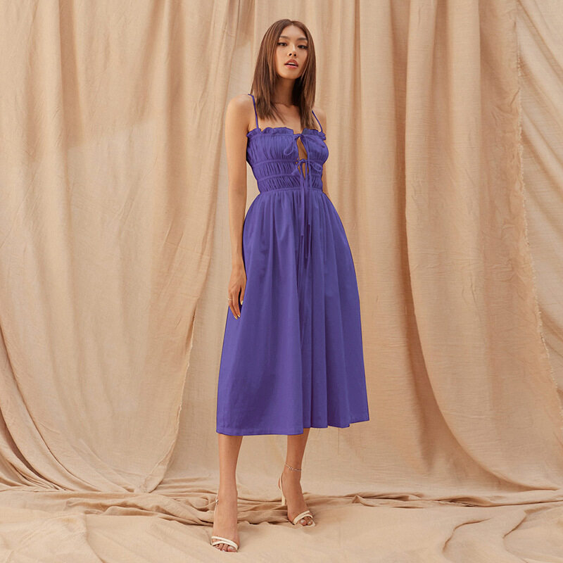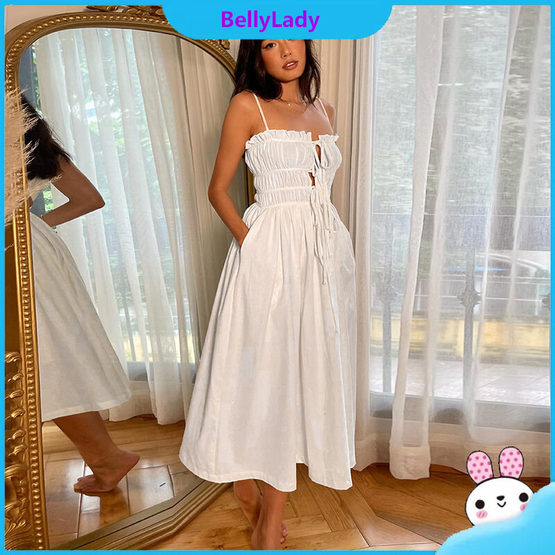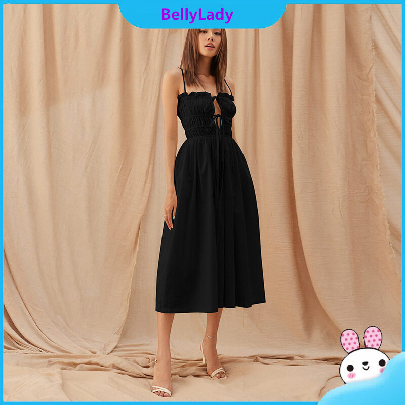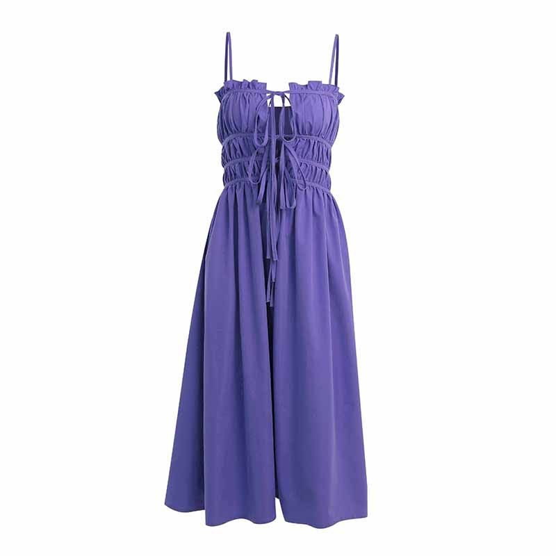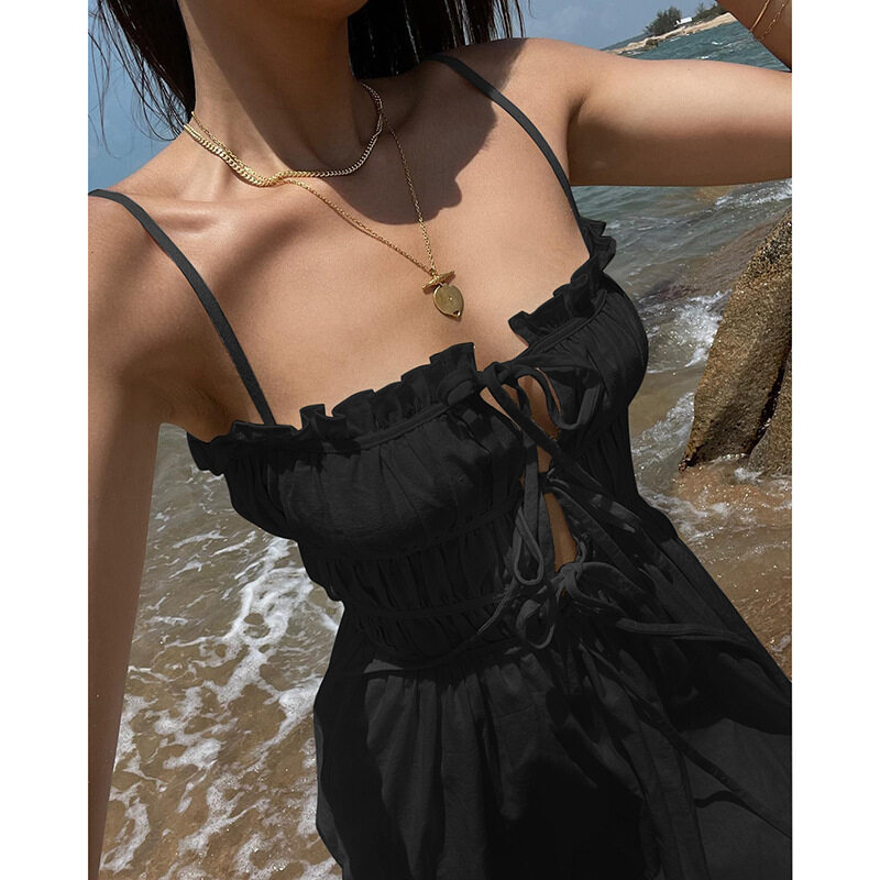 Women Suspender Dress Sexy Lace-up Hollowed-out Midi Skirt Fashion Solid Color High Waist Ruffled Dress