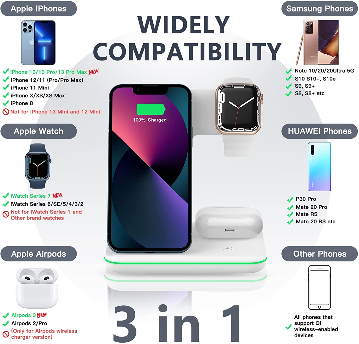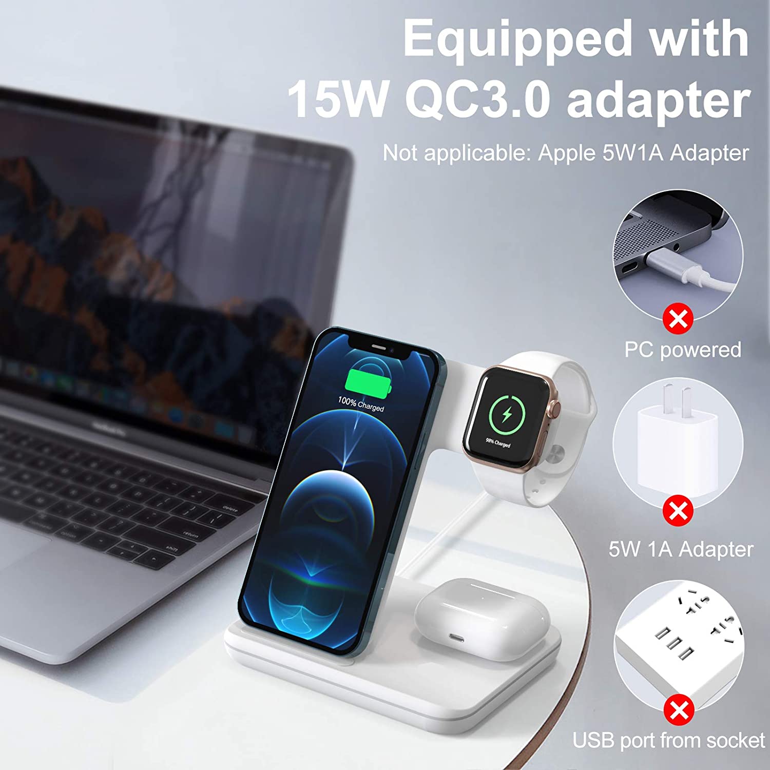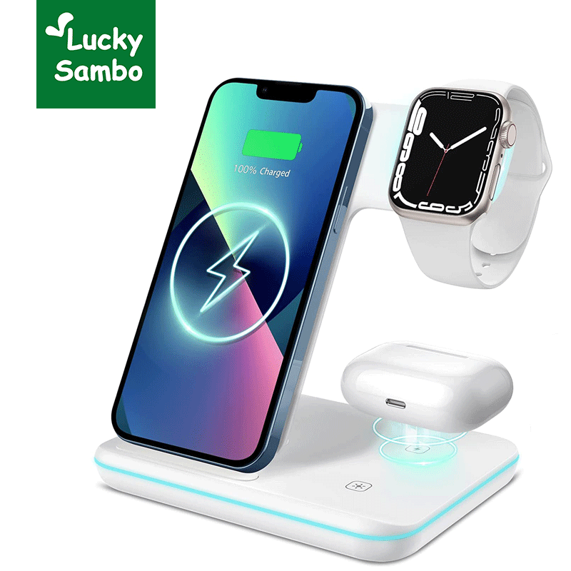 LuckySambo iPhone Wireless Charger, 3 in 1 Qi-Certified 15W Fast Charging Station Compatible with Apple Watch 8 7 SE 6 5 4 3 2, iPhone 14 /13 /12 /11/XS, AirPods Pro 3 2 1