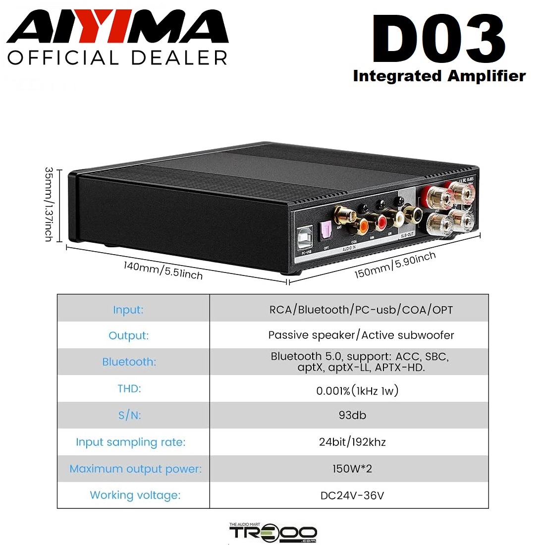 AIYIMA D03 Wireless Bluetooth Receiver/Streamer & Hi-Fi Integrated Amplifier (Official local stock - SG/UK plug)