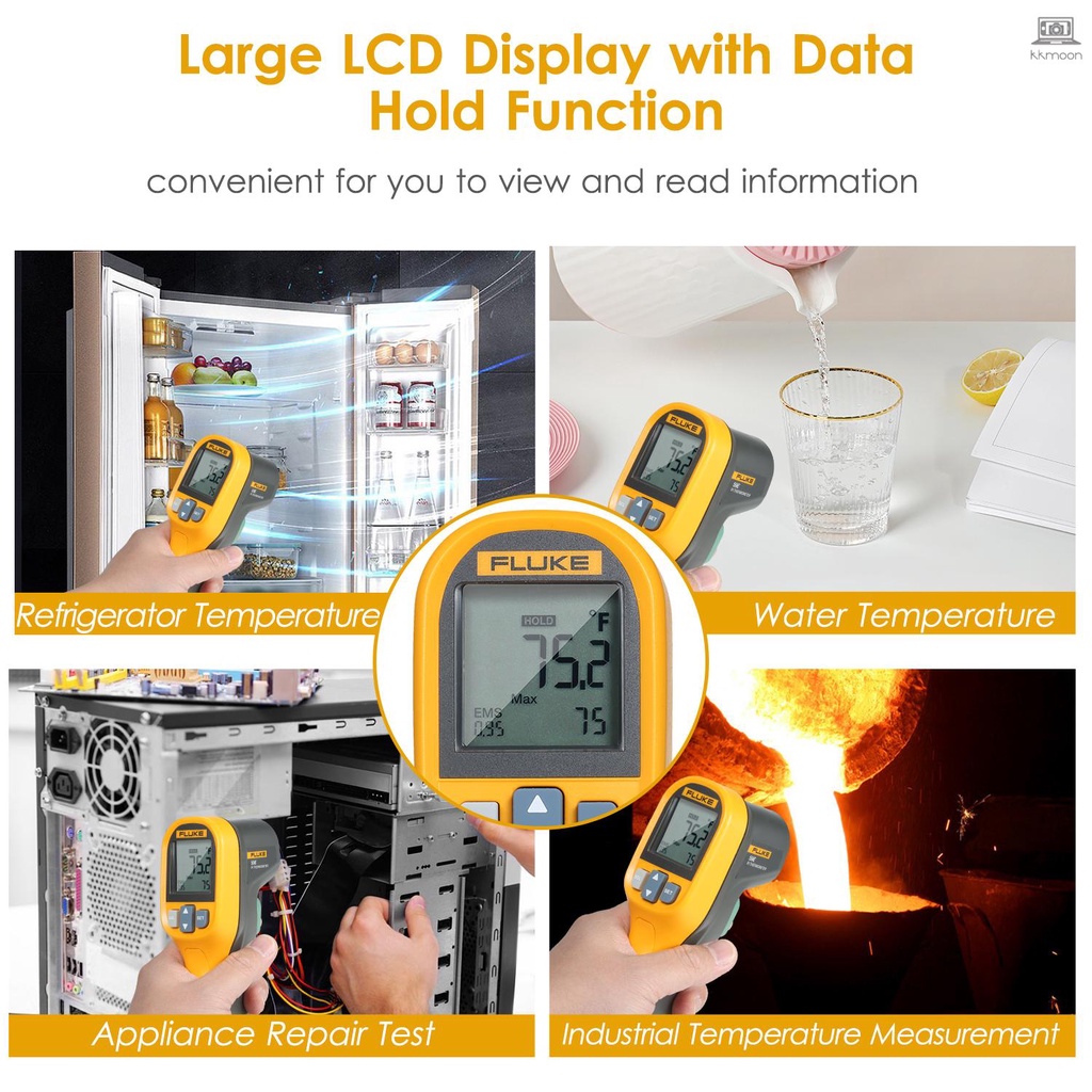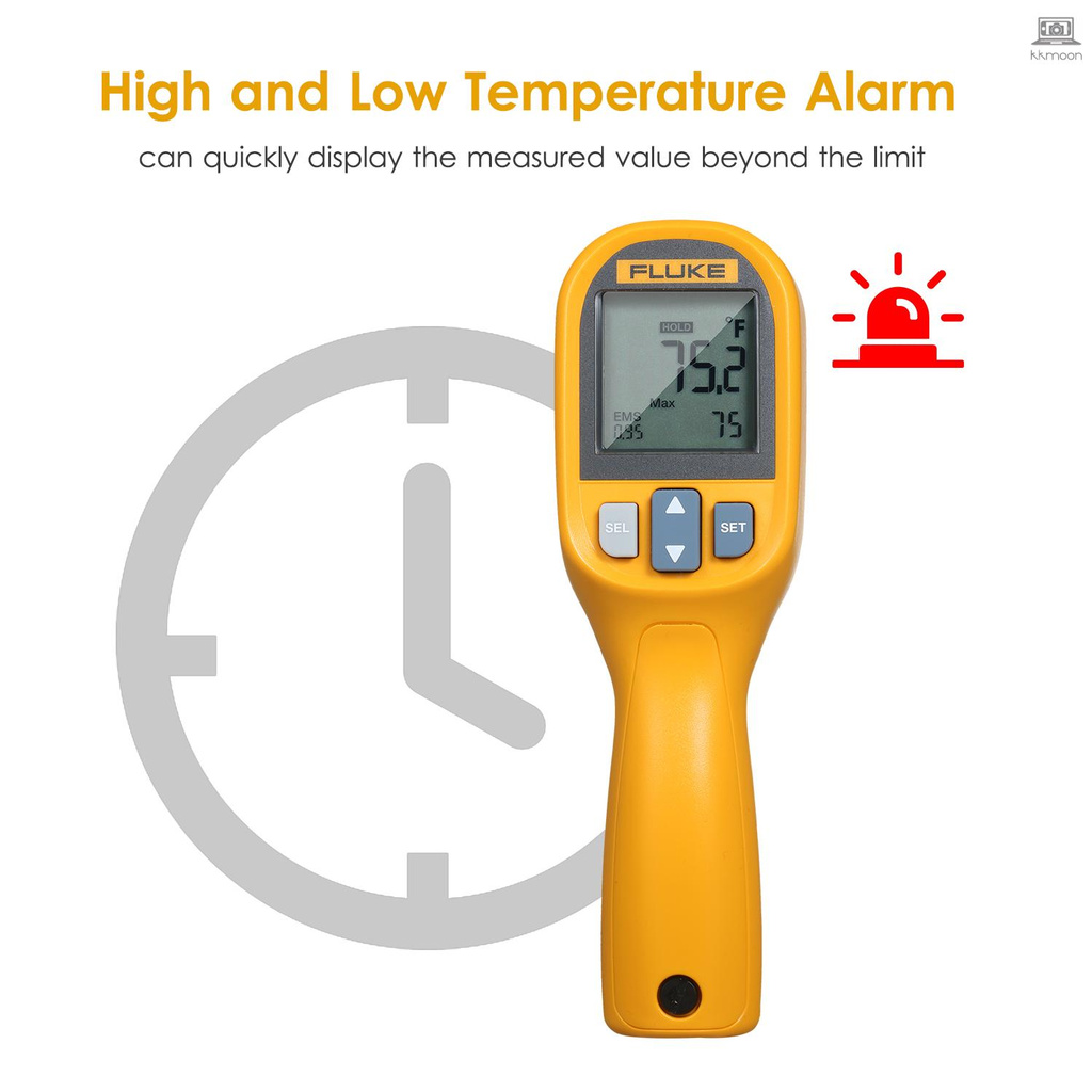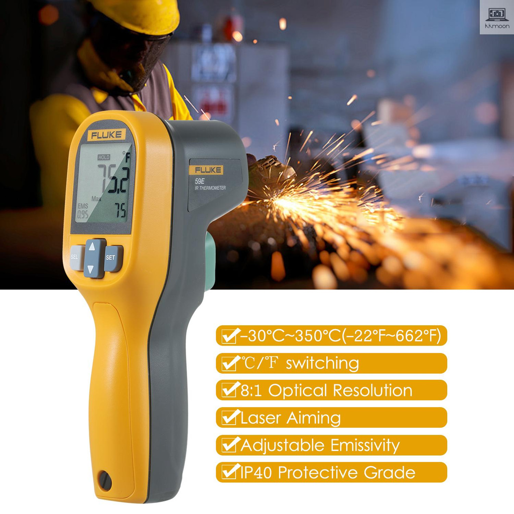 FLUKE 59E Infrared Mini IR Digital Handheld Temperature Tester 8:1 Laser Gun Digital IR Temperature Gauge -30~350°C(-22~662°F) This infrared allows you to take temperature measurements from a safe distance. Features: High Accuracy: adopts with precision laser technology to make sure the measurement is more accurate and repeatable. Measurement Range: -30°C~350°C(-22°F~662°F) wide temperature measuring range, display units in ℃/℉ switchable. High and Low Temperature Alarm: can quickly display the measured value beyond the limit. Digital Infrared : 0.5s fast measurement, laser sighting allows accurate targeting, 8:1 distance-to-spot at 90% energy. Clear LCD Screen: large LCD display with data hold function, which is convenient for you to view and read information. Lightweight & Compact: simple one-handed operation and easy to load the instrument into the toolbox. Other Functions: displays the minimum, maximum, or average temperature, or the difference between two measurements. Specifications: Material: ABS Measurement Range: -30~350℃ / -22~662℉ Accuracy: ≥0℃: ±2.0℃ of reading or ±2.0%, whichever is greater ≥-10℃~<0℃: ±2.0℃ <-10℃: ±3.0℃ ≥32℉:  ±4.0℉ of reading or ±2.0%, whichever is greater ≥14℉~<32℉: ±4.0℉ <14℉: ±6.0℉ Response Time(95%): <500ms (95% of reading) Spectral Response: 8~14mm Emissivity: 0.10~1.00 Distance-to-Spot Size: 8:1 (calculated @ 90% energy) Display Resolution: 0.1℃(0.2℉) Repeatability: ±1.0% of reading or ±1.0℃(±2.0℉), whichever is greater Operating Relative Humidity: 10%~90%RH non-condensing @ 30℃ / 86℉ Operating Range: 0~50℃ / 32~122℉ Storage Temperature: -20~60℃ / -4~140℉ (without battery) Operating Altitude: 2000m Storage Altitude: 12000m Drop Test: 1m Power Supply: 1 * AA IEC LR06 battery (NOT included) Item Size: 156 * 80 * 50mm / 6.14 * 3.15 * 1.97in Item Weight: 155g / 5.47oz Package Weight: 278g / 9.81oz Package Size: 26.7 * 18 * 7.5cm / 10.51 * 7.09 * 2.95in Package List: 1 * 1 * Manual (English)