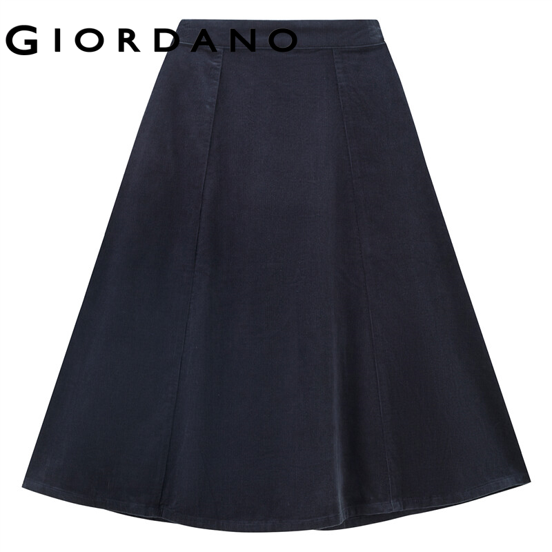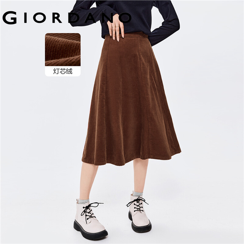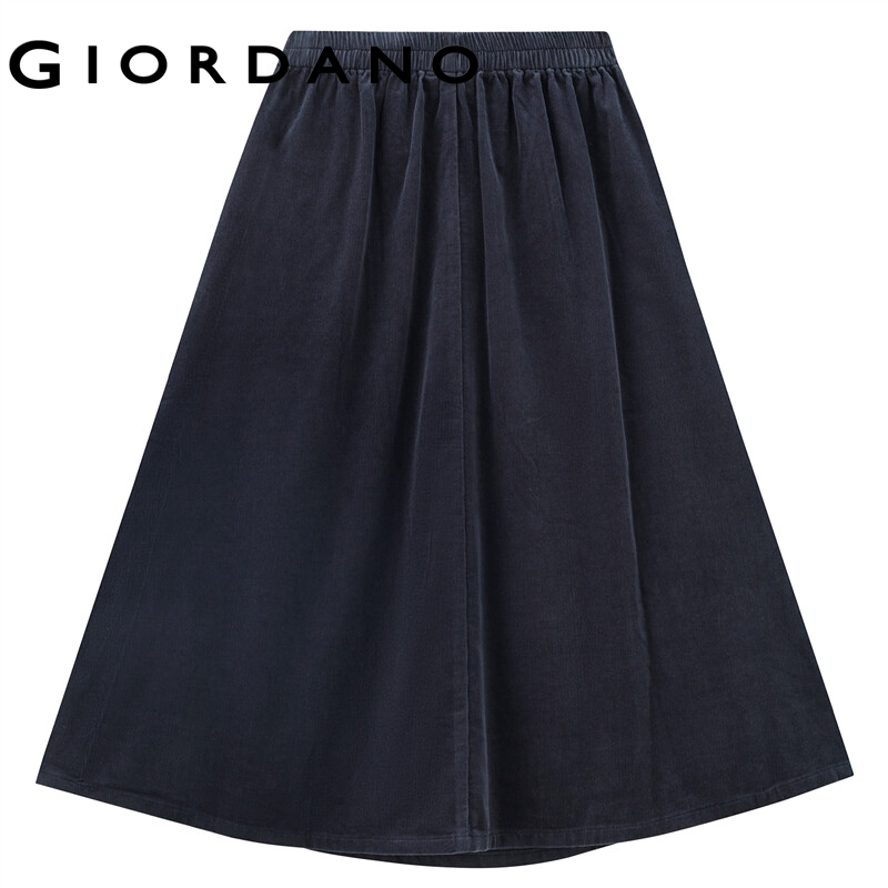 GIORDANO Women Skirts Half Elastic Waist 100% Cotton Corduroy Long Skirts Basic Solid Color Casual Gathered Midi Skirts 13462651