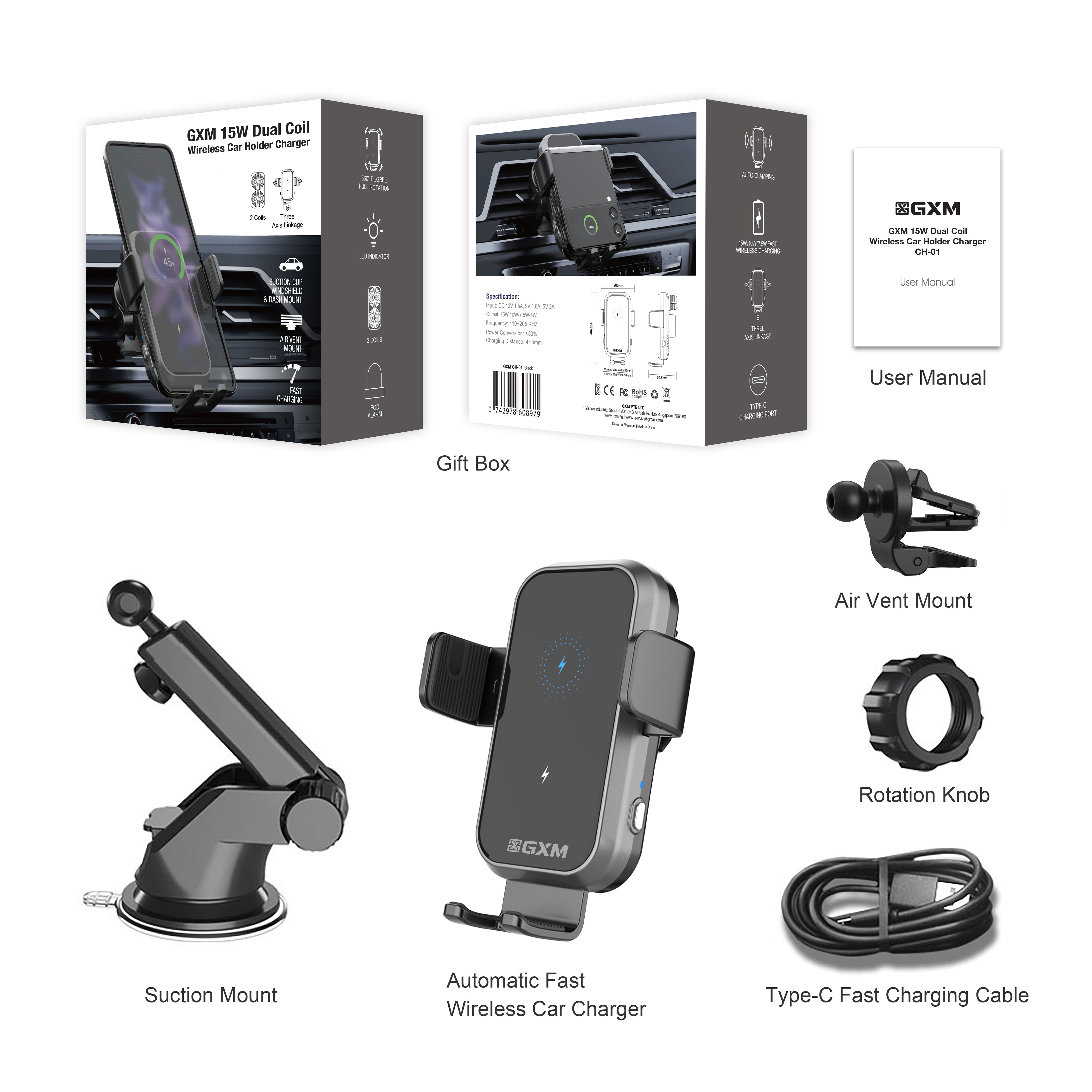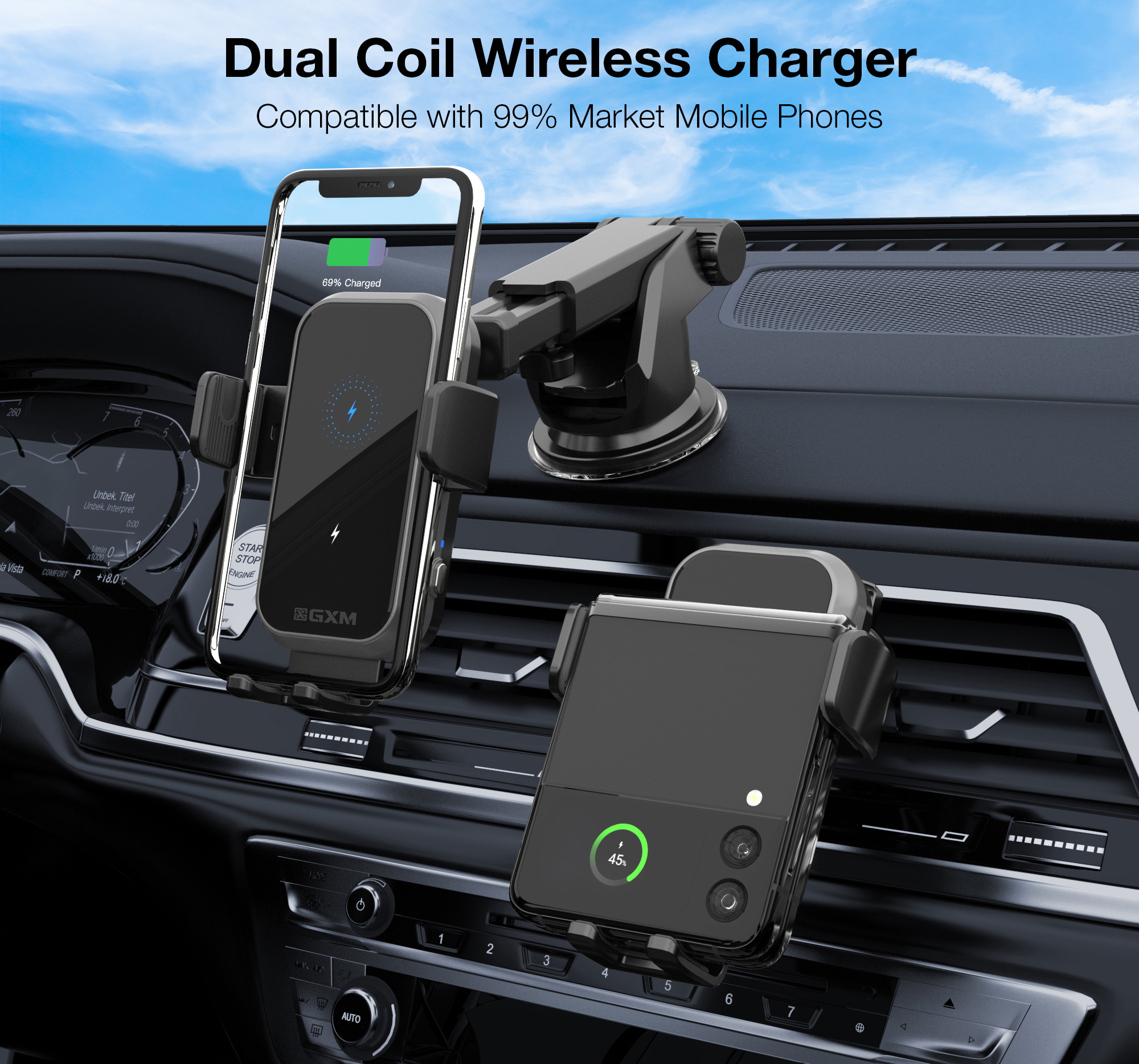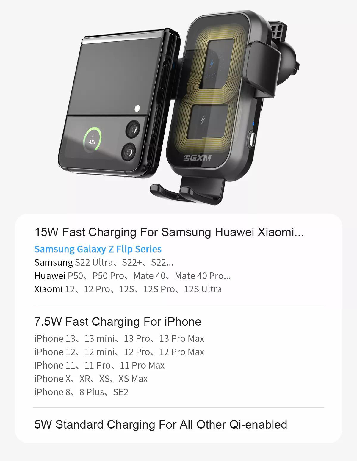 GXM CH01 15W Dual Coil Car Wireless Charger Phone Holder Compatible with Samsung Z Flip Series Three Axis Multi-angle Rotation Auto Clamping Car Phone Holder