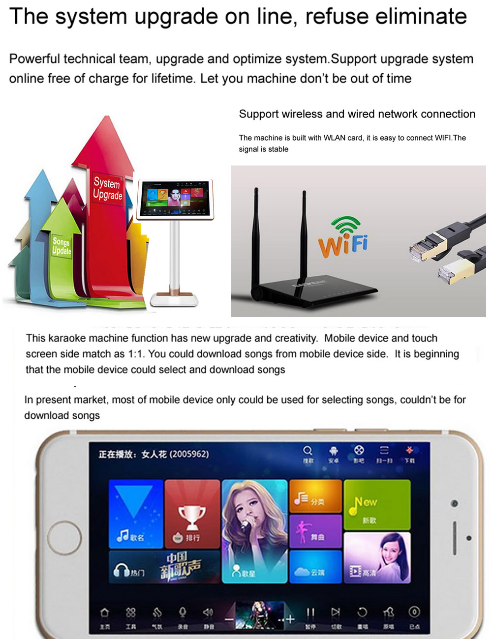 3.Download songs from cloud.There are more than 300K differentlanguage songs(Mandarin,Cantonese,Taiwanese,Vietnamese,English,Korean,Japanese,Thai,Burmese,Malay,Filipino,Spanish,etc. More than 10 kinds of songs on cloud ) on Cloud for download.The system updatessongs each every week.It will hint Synchronize new updates cloud songs if there are new songs.